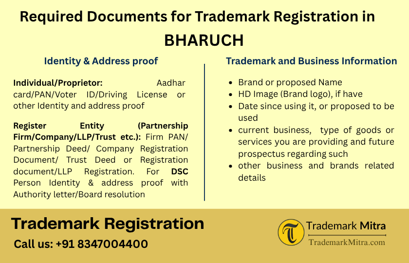 over the time of application of trademark application, we may ask you to provide other document and information in order to provide you best possible solution and To Made Trademark application.Download list of Document required to register Trademark in Bharuch