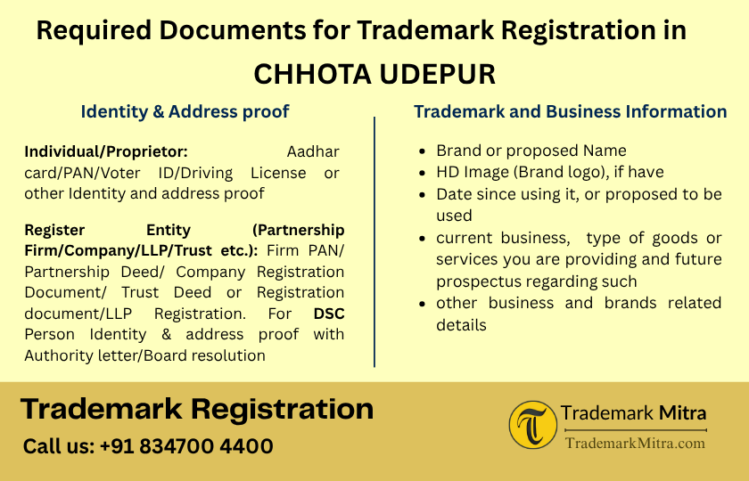over the time of application of trademark application, we may ask you to provide other document and information in order to provide you best possible solution and To Made Trademark application.Download list of Document required to register Trademark in Chhota Udepur