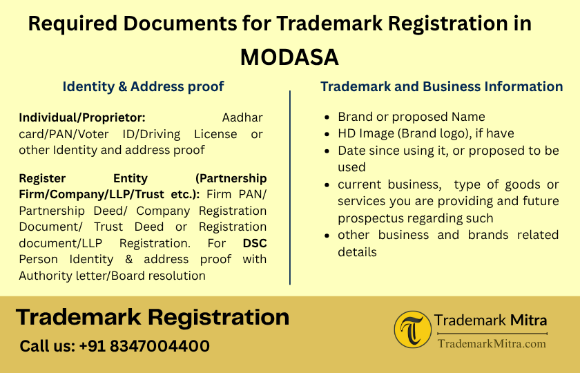 over the time of application of trademark application, we may ask you to provide other document and information in order to provide you best possible solution and To Made Trademark application.Download list of Document required to register Trademark in Modasa